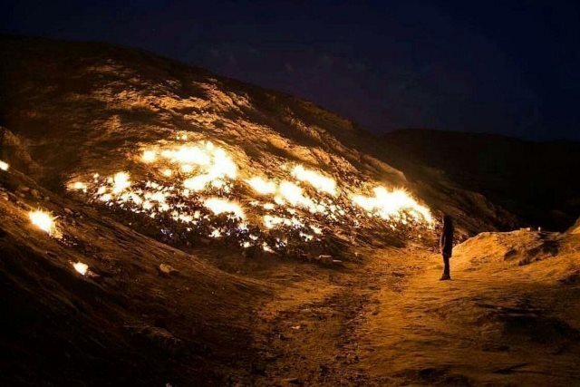 شعلههای رقصان آتش در تشکوه همیشه روشن هستند و با تاریکشدن هوا، نور شعلههای آتش مشخصتر از همیشه است. هر شعله آتش روی دامنه کوه مثل چراغی سوسو میزند و جذابیت کوه را به اوج میرساند.