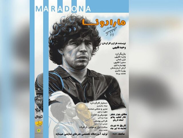 نمایش «مارادونا» به نویسندگی، طراحی و کارگردانی وحید فقیهی تا ۱۵ تیر ۱۴۰۳ ساعت ۱۹:۳۰ در پلاتو استاد لاریان تالار آفتاب اهواز پذیرای علاقهمندان به هنر نمایش است.